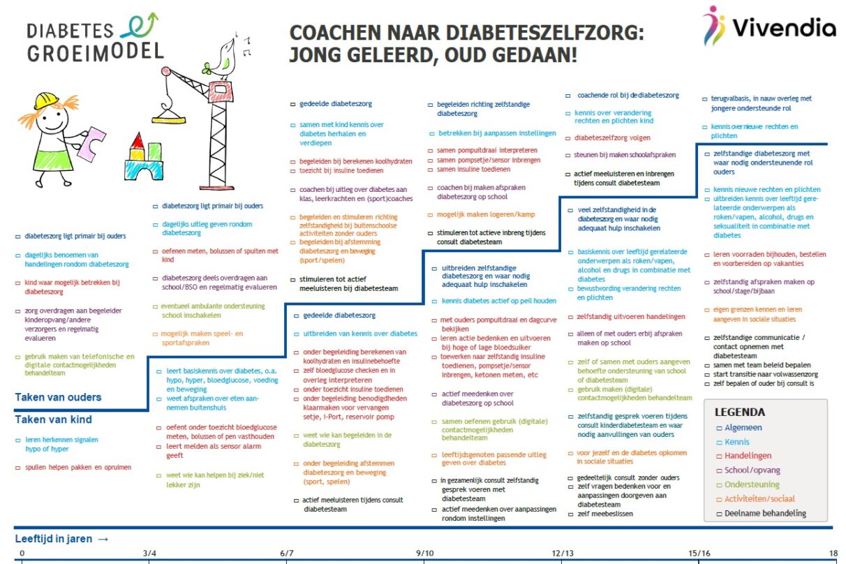 Het Diabetes Groeimodel is er voor jou en je ouders. Je vindt er informatie die bij jouw leeftijd past. Als je nog kleiner bent, zorgen je ouders voor jouw eten en drinken. En dat jouw bloedsuiker goed blijft en je op tijd jouw insuline krijgt. Als je groter wordt, ga je meer dingen zelf doen. Dat gaat met kleine stapjes. In het model hieronder zie je welke stapjes dat zijn.
